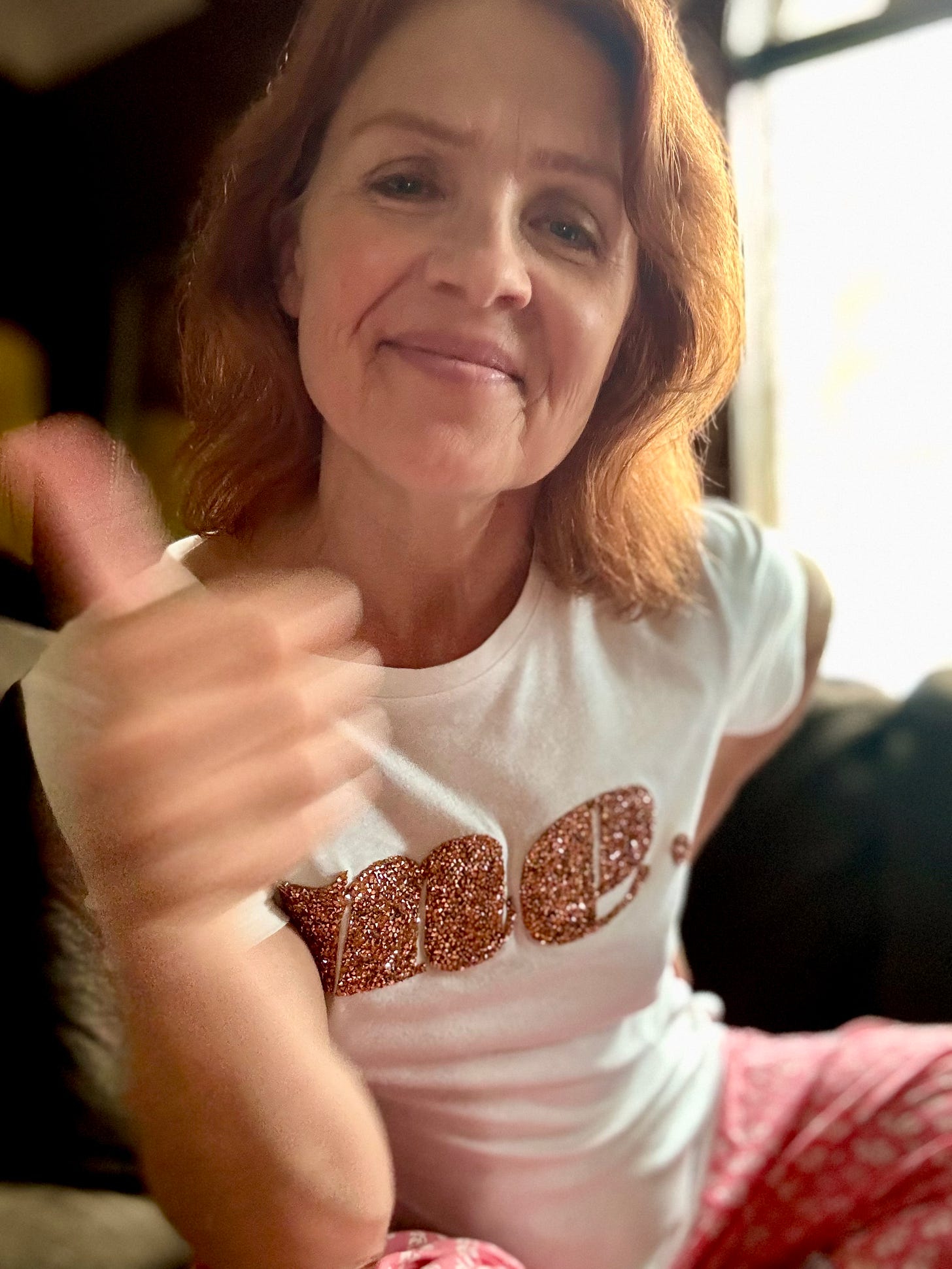 It just occurred to me as I lie here on the couch, still recuperating from my dazzling, yet depleting trip to Los Angeles, duly rocking my latest thrift store find, that M-E are the first two letters in MEMOIR.